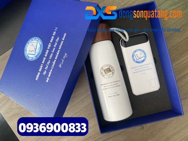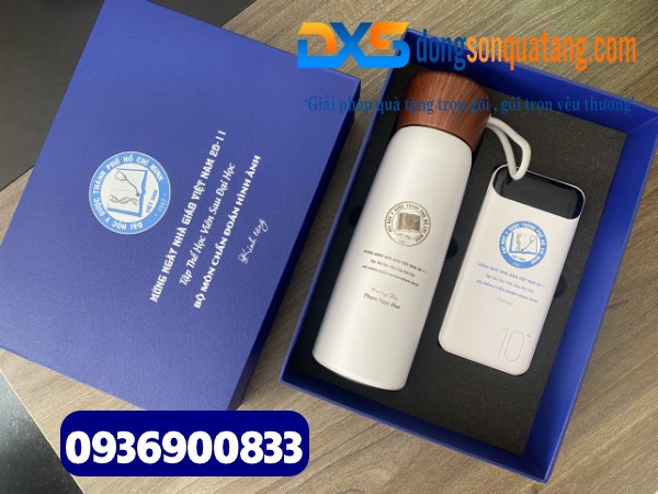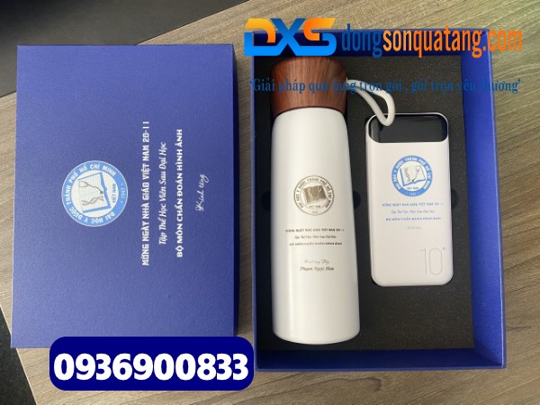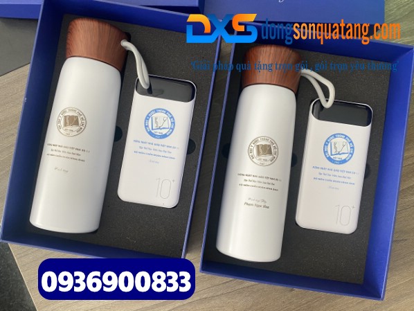 Set quà tặng Công Nghệ 2 sản phẩm ( Pin sạc dự phòng + Bình giữ nhiệt nắp vân gỗ ) In khắc logo làm quà tặng Sự Kiện HCM