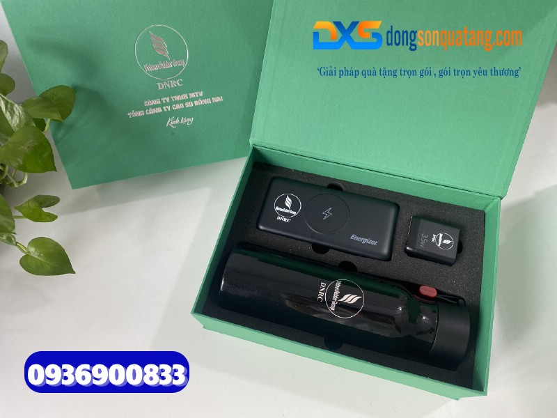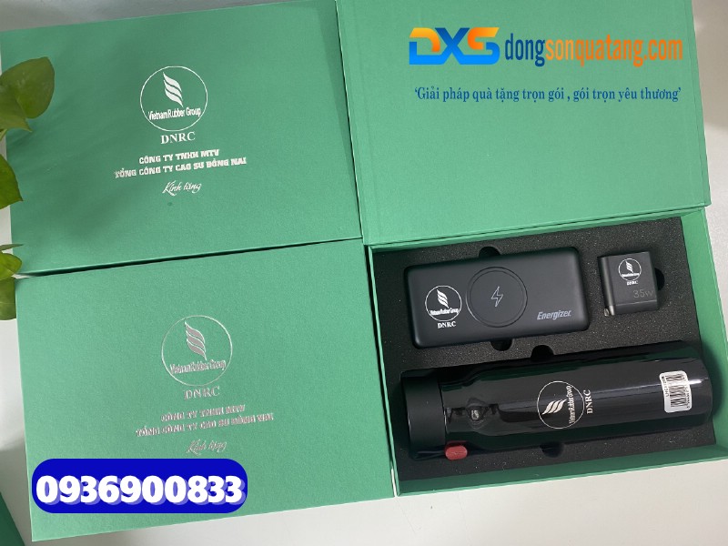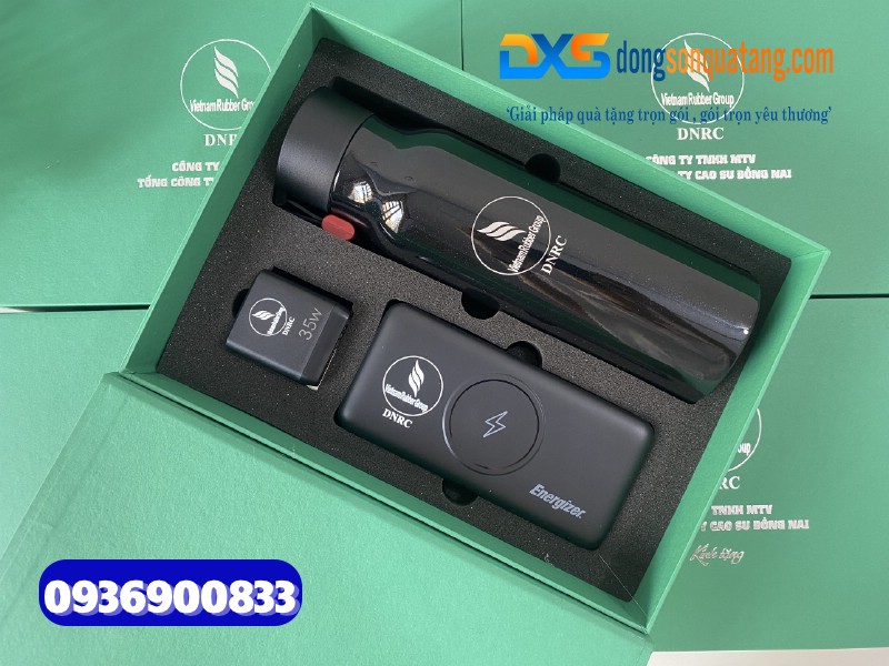 1.Set quà tặng công nghiệp cao su ( Bình giữ nhiệt Locknlock + Adapter du lịch & Pin sạc dự phòng Energizer )- In logo Tập Đoàn Công Nghiệp Cao Su Việt Nam (VRG)